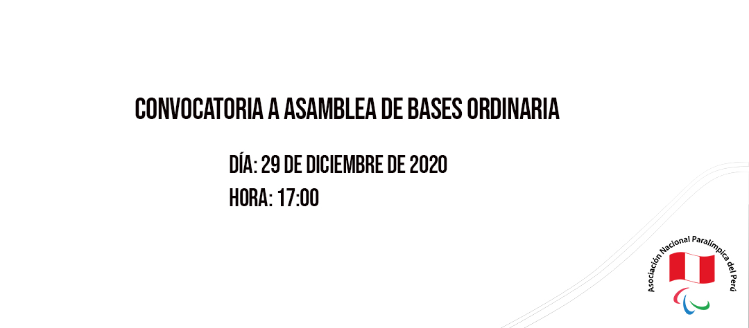 En virtud de los artículos 11° de nuestro Estatuto y en el marco de lo establecido en el Decreto de Urgencia N°100-2020 mediante el cual se dictan medidas para la convocatoria y celebración de Juntas de Accionistas y Asambleas no presenciales o virtuales, se convoca a todos los asociados hábiles para la celebración de la próxima Asamblea de Bases Ordinaria de la Asociación Nacional Paralímpica del Perú a realizarse el 29 de diciembre de 2020 en el sitio electrónico Zoom con ID N° 875 97804277 a las 17:00 horas en primera convocatoria y a las 18:00 horas en segunda convocatoria, ambas con el siguiente link: https://us02web.zoom.us/j/87597804277