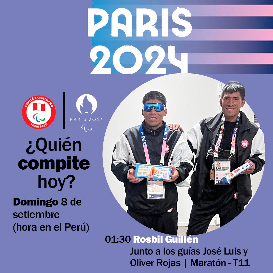 París, 8 de setiembre. El último peruano en competir, lo hará hoy, muy temprano. Rosbil Guillén participará en el maratón de los Juegos Paralímpicos, corriendo junto a los guías José Luis y Oliver Rojas. La prueba está fijada para comenzar a las 8:30 de la mañana, hora local (01:30 a.m. en el Perú).