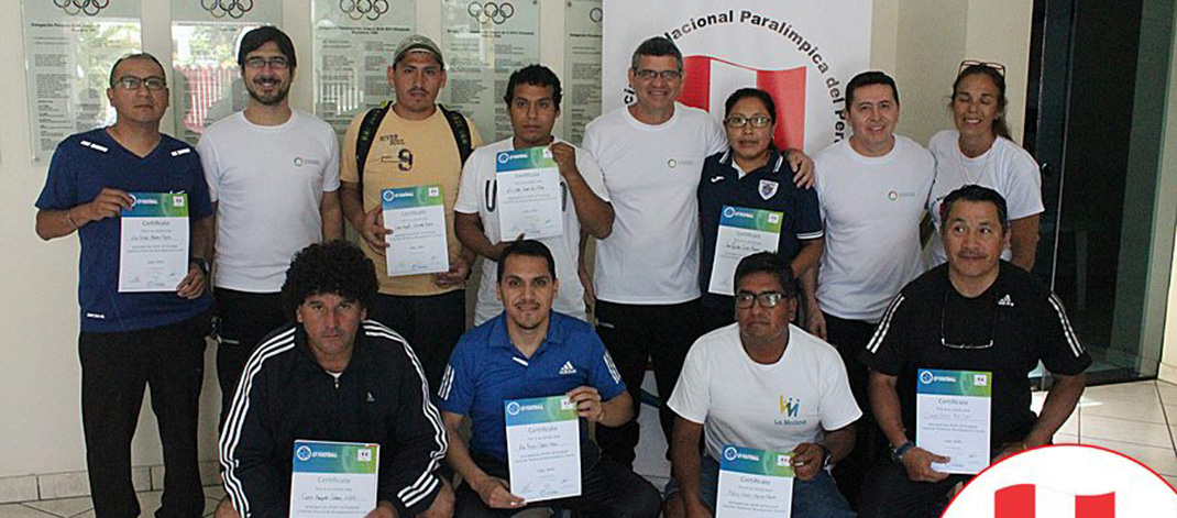 Lima, 9 de diciembre. El grupo de profesores de educación física y profesionales que atendieron el Curso de Entrenadores de Fútbol 7 recibieron esta tarde sus diplomas en la ceremonia de clausura que llevó a cabo la Asociación Nacional Paralímpica del Perú en su sede ubicada en la Videna.
